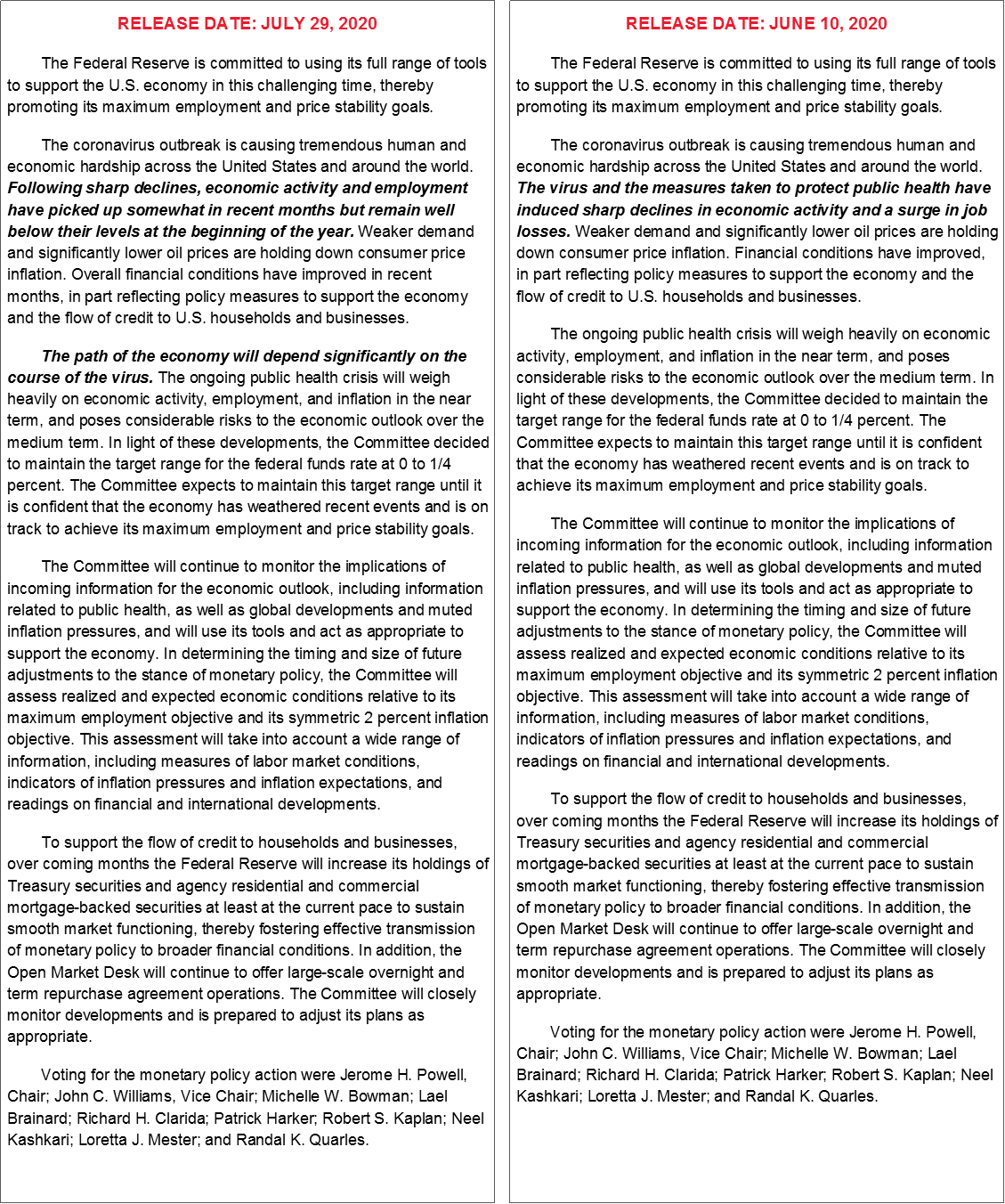 Nevertheless, the emphasis upon forward risks was retained and the statement spelled out a lack of confidence in forecasting future outcomes by bluntly stating that “The path of the economy will depend significantly on the course of the virus.” Thus, the Fed essentially faded the rebound evidence.