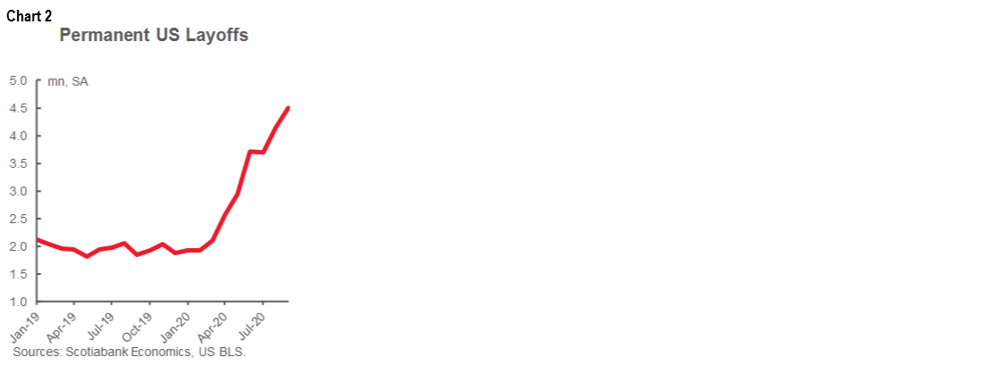 You can see this in terms of the rising number of outright job losses in the US. Permanently laid off workers not expected to be called back continues to rise (chart 2). That figure is now at its highest since November 2013. It’s not done climbing yet but remains well shy of the GFC peak of 8.3 million. As another indication of the issue at hand, note the growing wedge in chart 1 between what is happening to aggregate payrolls versus the temporarily laid off which confirms that ex-callback jobs are being lost.