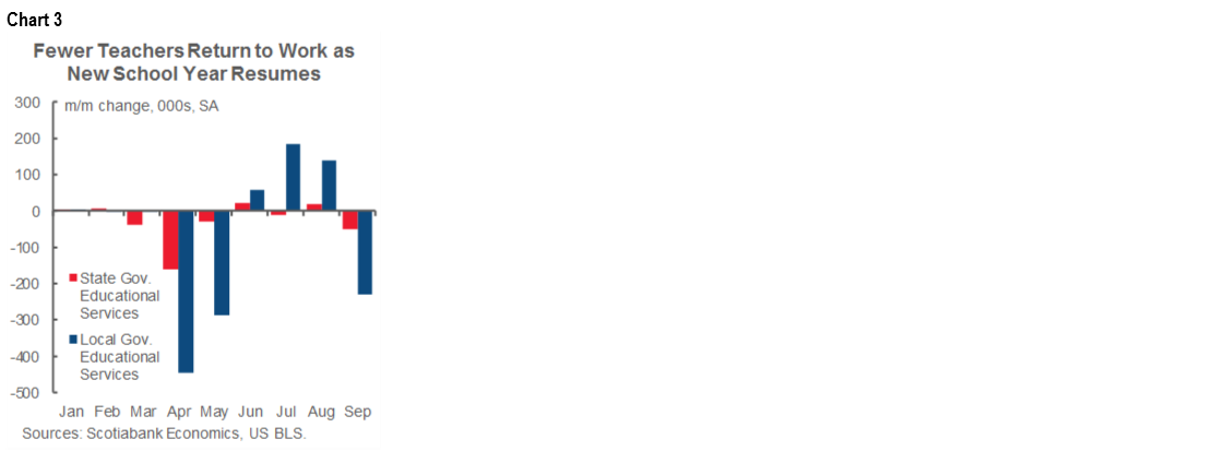 The second reason why the report is disappointing is that the main reason why the 661k figure fell shy of expectations had to do with job destruction in the education sector (chart 3). Education sector jobs at local governments fell by 231k while they fell by 49k at state governments for a combined hit of 280k. The case for removing this effect from the headline miss is that it is a narrow distortion that masks what is going on in the underlying private sector. The case for not removing this hit is that a job is a job and these are generally good jobs we’re talking about. I lean toward the latter interpretation in terms of not fading the headline miss as the lingering impact of covid-19 continues.