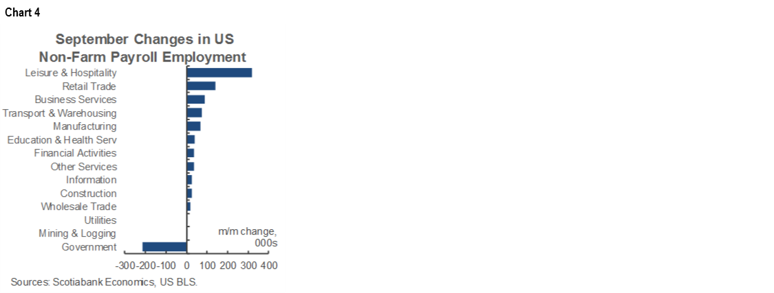 There was otherwise decent breadth across the sectors as shown in chart 4. Goods sector employment was up by 93k with services up 784k. Within goods, there was a 66k rise in manufacturing employment and a 26k rise in construction jobs. Within services, leisure/hospitality was up 318k, retail was up 142k, and other trade/transport up 95k.