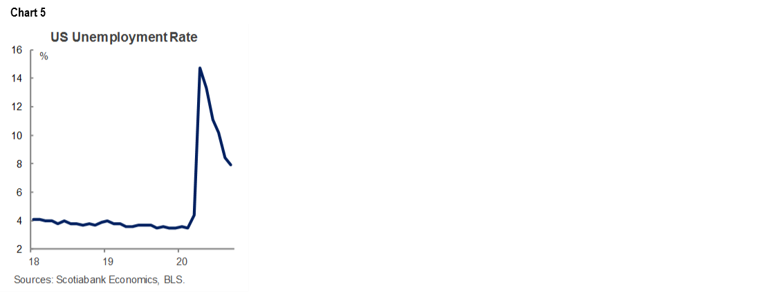 Wage growth was in line with expectations at 0.1% m/m and 4.7% y/y (chart 6). It remains high because of the ongoing pandemic distortion that resulted in a disproportionate hit to the jobs of lower than average wage workers. Thus, 5% wage growth is not to be treated as a good sign.