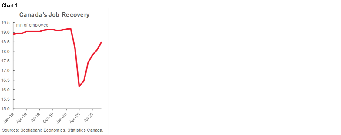 As chart 1 shows, over three-quarters of jobs lost to date have been recouped. Canada is now down a net 720k jobs compared to the peak in February before the pandemic struck and has recouped 2¼ million jobs that were lost.