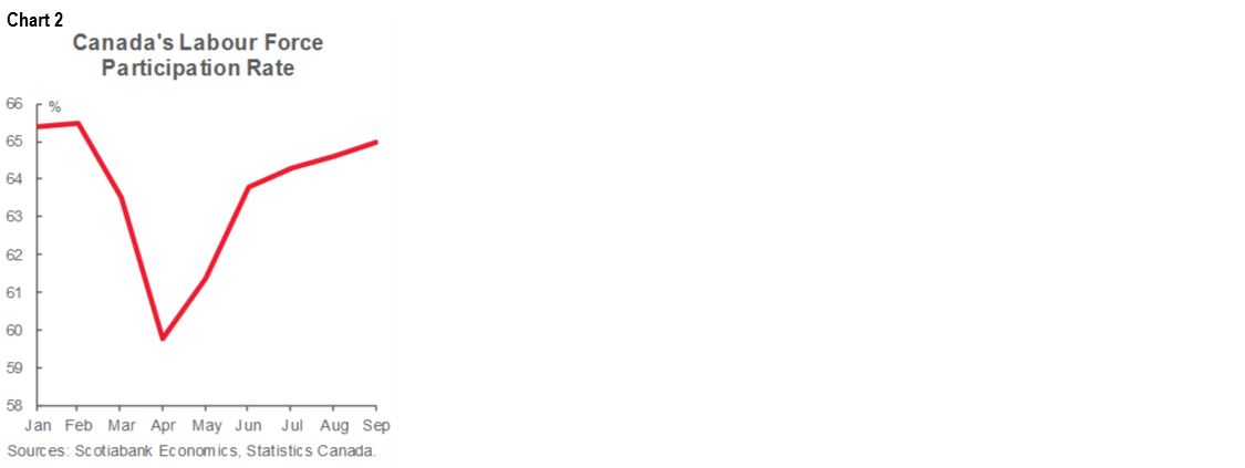 The unemployment rate fell by 1.2 percentage points to 9.0% from 10.2% because the 378k job gain offset an extra 164k that re-entered the labour force. As chart 2 depicts, the labour force participation rate is edging closer to where it was pre-pandemic. It increased by another 0.4 points to 65% of the population who are either employed or actively looking for work. That is only ½% lower than where the participation rate stood in February before the pandemic shutdowns.
