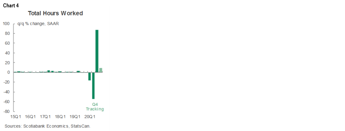 Hours worked were up by 1.9% m/m in September which is still strong but the slowest expansion yet. Still, that was enough to drive overall hours worked up by +88% q/q at a seasonally adjusted and annualized rate in Q3. A further 9.0% annualized gain in hours worked is baked into Q4 based solely upon the way Q3 ended and the Q3 average (chart 4). So, since GDP is an identity expressed as hours worked times labour productivity with the latter being real GDP over hours worked, for the massive gain in hours worked to translate into a much lower pace of gain in GDP would have required growth in activity readings to be much lower in Q3 to offset the hours worked gain. That could well have been the case especially after taking into account inventory and import leakage effects on GDP in the quarter.