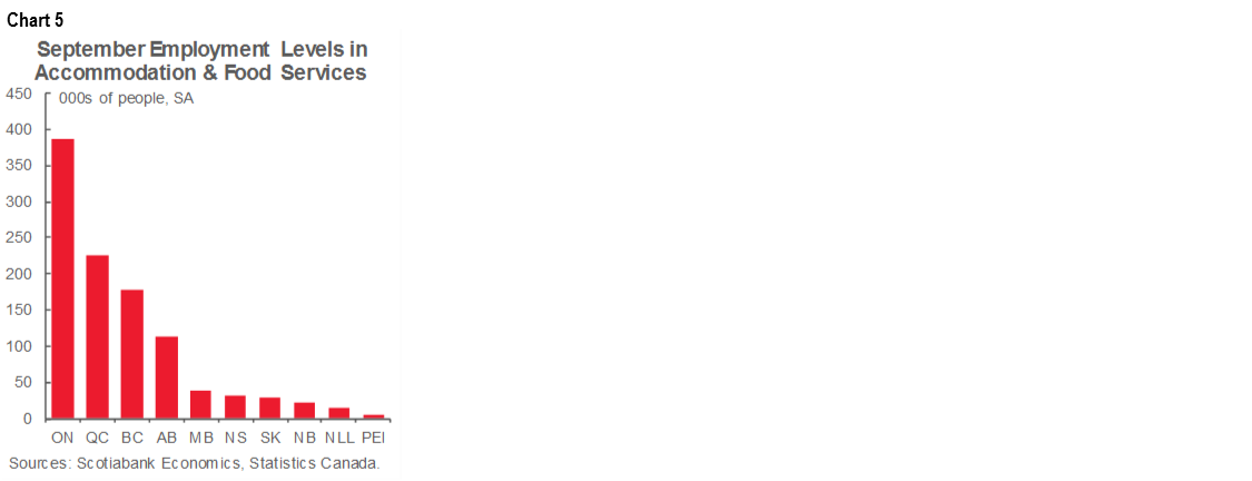 So overall, this could be the last great jobs report because the mothers and youth effects are unlikely to repeat. Going forward, there is unlikely to be an additional back to school effect in October because it all seemed to have happened in September. Further, given restrictions that Quebec, Ontario and others have introduced or are about to reintroduce (e.g. Ontario today), the youths category could be particularly vulnerable going forward. The final chart depicts the most vulnerable category of employment to increased restrictions. Over one million Canadians work in the accommodation and food services sector and almost 40% of those work in Ontario.
