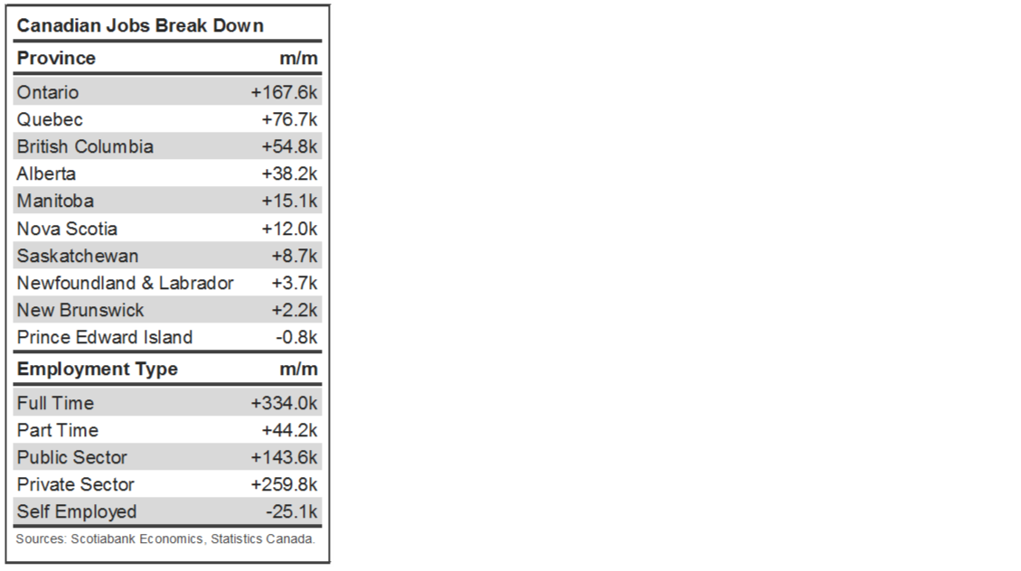 By province, gains were led by Ontario (+168k) and Quebec (+77k) with BC (+55k) and Alberta (+38k) also posting solid increases. All provinces posted gains except for a tiny loss in PEI. I think Ontario’s large gain reflected its lagging reopening plans particularly in the country’s biggest city of Toronto compared to elsewhere.