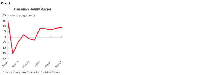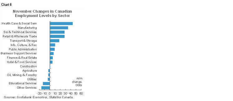 Hours worked were up 0.7% m/m SA in November. Canada has been registering powerful monthly gains during four of the past five months. Hours worked were up 6.8% q/q SAAR in Q3 and are now tracking an explosive 9.3% q/q rise in Q4 (chart 7). Since GDP is an identity defined as hours worked times labour productivity, the 9.3% Q4 rise points to very strong GDP growth. The caveat is again the fact that the reference week did not capture BC’s flooding that hit the following week but that’s unlikely to put a sizable dent in the nationwide tallies.