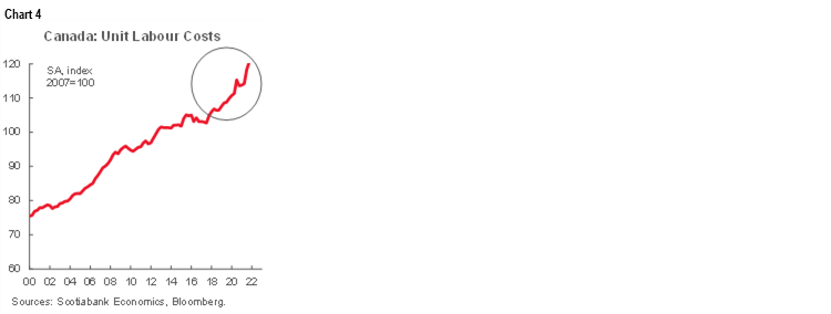 We also got an update on productivity-adjusted labour costs when StatCan updated unit labour costs to Q3 (chart 4). I had to adjust the scale to accommodate the acceleration! ULCs were up 7.7% q/q SAAR in Q3. Unit labour costs were relatively tame for many years coming out of the Global Financial Crisis. That started to change around 2017–18 when this yardstick began to rise more rapidly. It is now going vertical. When employment costs are far outstripping productivity growth it can tend to fan inflationary pressure.