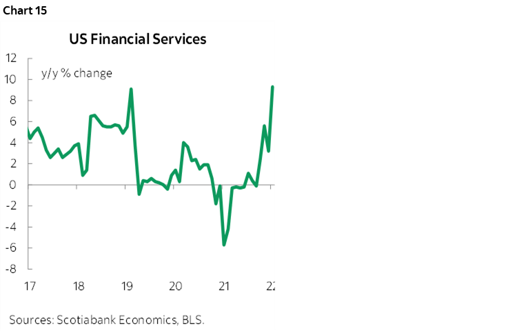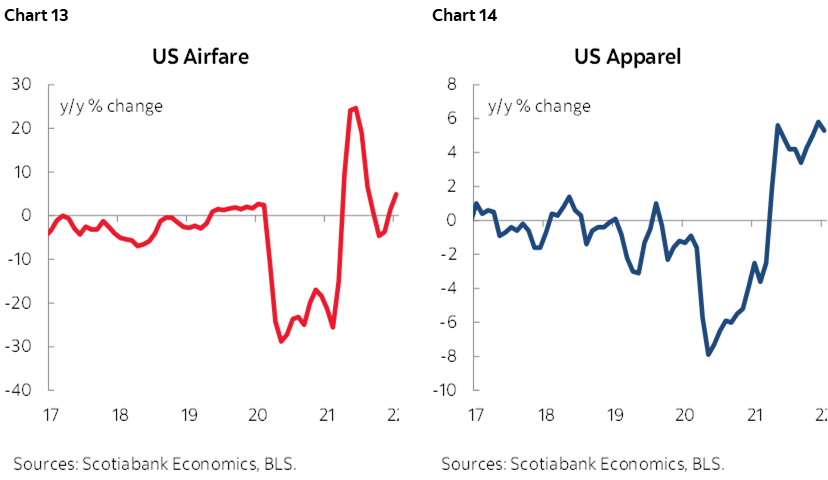 Charts 7–15 provide a breakdown of some of the categories. What I was most surprised was the paucity of evidence that high contact service price inflation ebbed. That was only true in terms of lodging that fell 3.9% m/m. Otherwise, food away from home (ie: mostly in-person dining and take-out) was up 0.7% m/m and airfare jumped 2.3% m/m higher.