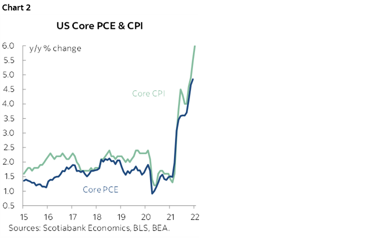 As chart 1 shows, there is no evidence that price pressures are letting up at the margin defined as the annualized month-over-month and seasonally adjusted rates of increase in headline and core CPI inflation. In fact it’s the opposite. The annualized pace of monthly CPI gains has been running between 7–11% over the past four months. The annualized pace of monthly core CPI gains has been running between about 6½ % and 7½%.