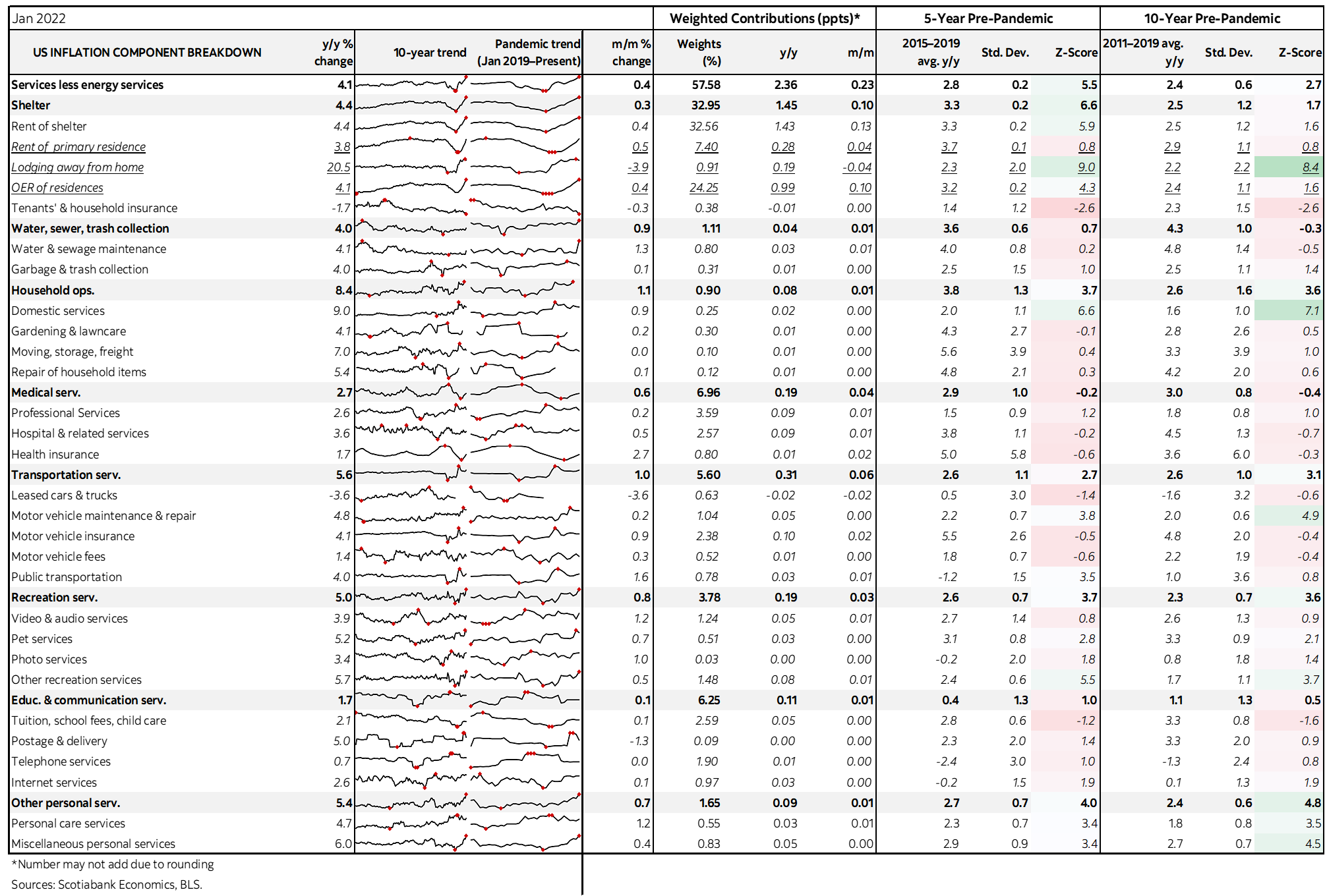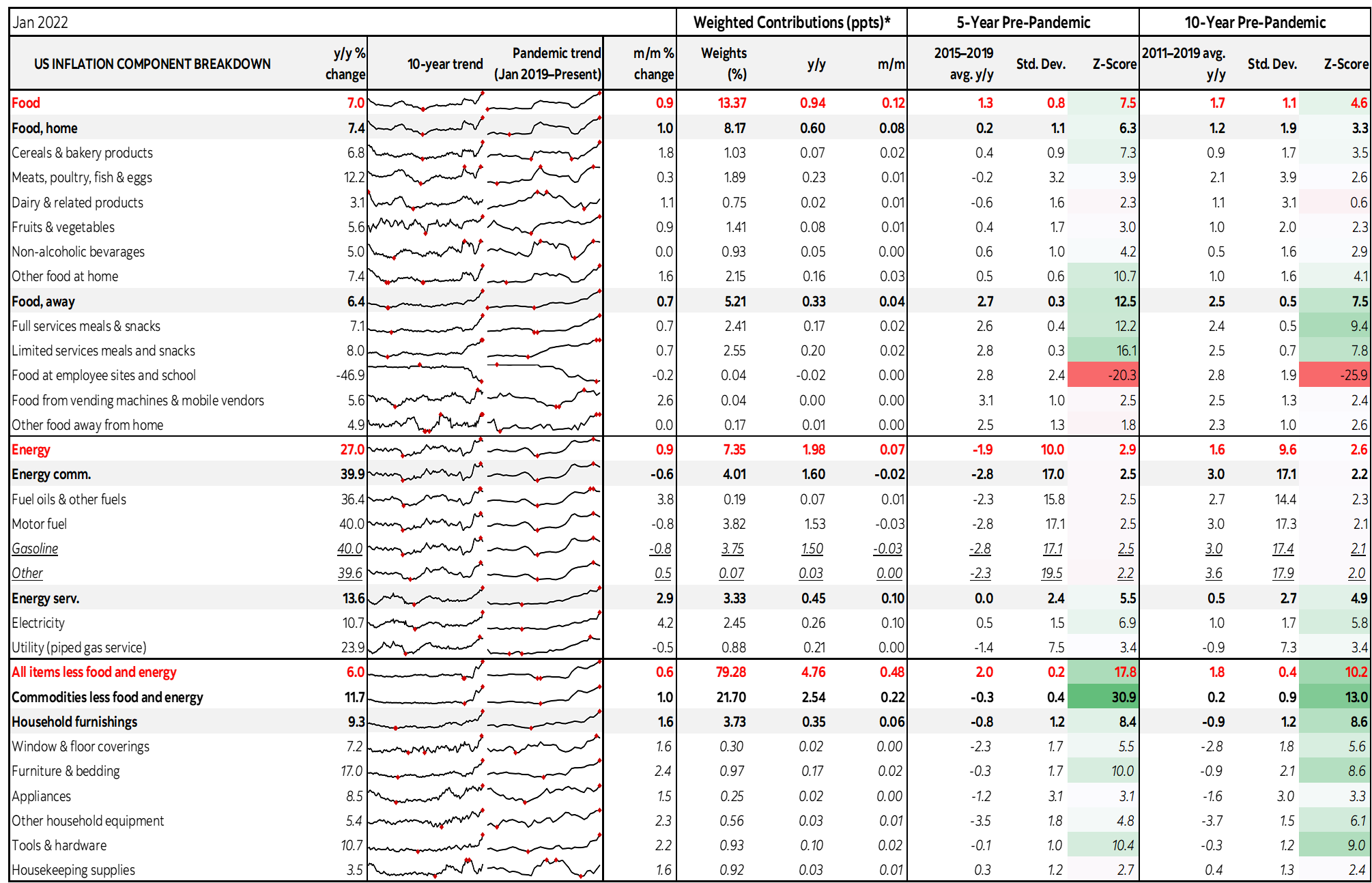 Forty-year highs in inflation accompanied by remarkably high breadth and no signs of pressures letting up at the margin should deeply worry the FOMC. It is so far behind the inflation fight with the US at or beyond maximum employment alongside rising wage pressures that this is going to be very difficult to address with monetary policy tools absent abrupt and harsh policy movements. Persistent supply chain pressures combined with hot demand (ie: it’s both!) in a booming US economy that is entering excess aggregate demand risk unmooring wage and inflation expectations. The odds of a 50 point hike in March and roll-off commencing as soon as Q2 have gone up again. The cost to the Fed’s misreading of inflationary pressures is that the Biden administration could well be a lame duck presidency over the duration of his term which could reduce policy flexibility down the road should the economic outlook require it.