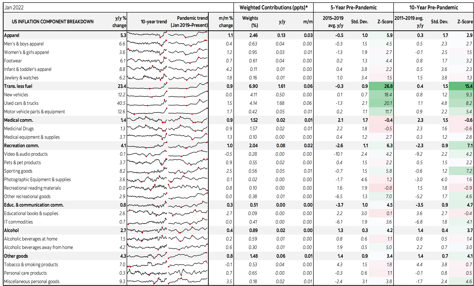 A breakdown of the CPI basket is shown in charts 3–6. Chart 3 shows the unweighted y/y changes in CPI inflation by component; 84% of the CPI basket is over 2% y/y which indicates very high breadth. This is clearly not just a relative price shock versus generalized inflation. Chart 4 does the same thing but weights the individual components in terms of their shares in the CPI basket. If you’d like to avoid inflation then don’t own a house, don’t drive a vehicle, don’t go anywhere and don’t eat.
