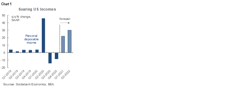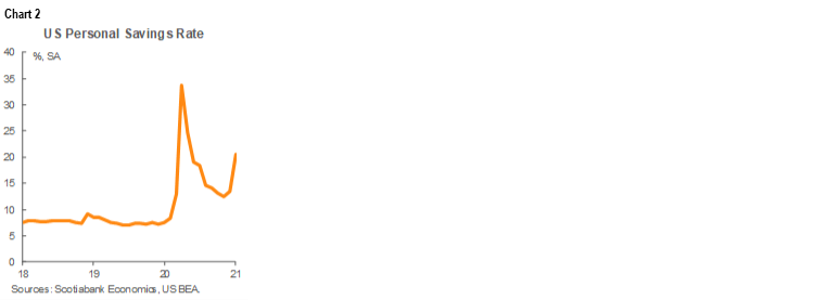 But it’s likely only just the beginning. The saving rate shot up to 20.5% in January for the highest rate since last May (chart 2). The first-round effect of disbursements is to spend a little and hoard a lot. The second-round effects will likely be to spend those amounts in a manner akin to what happened last summer before vaccines were in sight. Further, because many consumers expect another round of cheques and broader stimulus, they may pull that forward and spend some of the proceeds in anticipation while leveraging some of it. Some of the proceeds are still likely to be put toward balance sheet repair and maybe some will think in Ricardian equivalence terms by looking ahead to the possible future tax burden, but we’re talking US consumers here!!