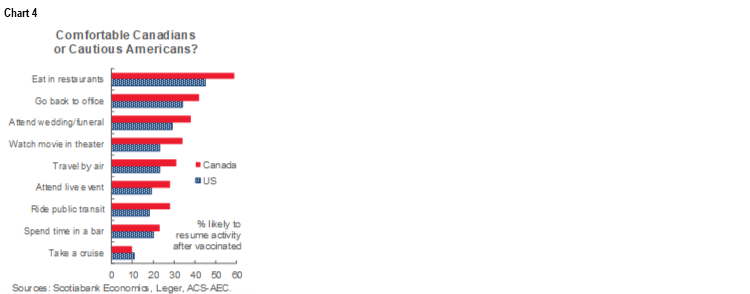 More important is the issue of whether behaviour adapts once the US has full inoculation of the adult population by summer. Chart 4 is repeated here in that it shows 20–50% of respondents in both the US and Canada indicate that after getting jabbed, they will return to pandemic-affected activities especially things like eating in restaurants and returning to the office when they get tired of one way conversations with the family dog. These responses could build with improved confidence, but going from depressed levels of these activities now to 20–50% could well be a very powerful growth catalyst. If not, consumers are likely to spend their stimulus and what they save from not spending on these other activities on all manner of other things. What’s rule number 1 in forecasting the US consumer? Right, never underestimate their capacity to spend, spend and spend some more.