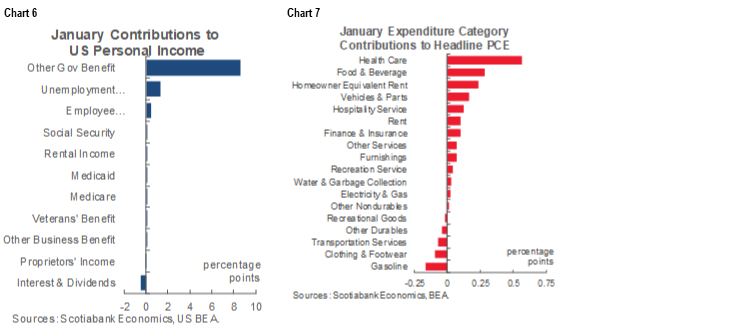 Nominal personal income increased by 10% m/m SA in January with inflation-adjusted personal disposable income up 11% m/m. Excluding transfers, inflation-adjusted income fell 0.5% m/m for the third consecutive monthly decline. The massive offset came through transfers.