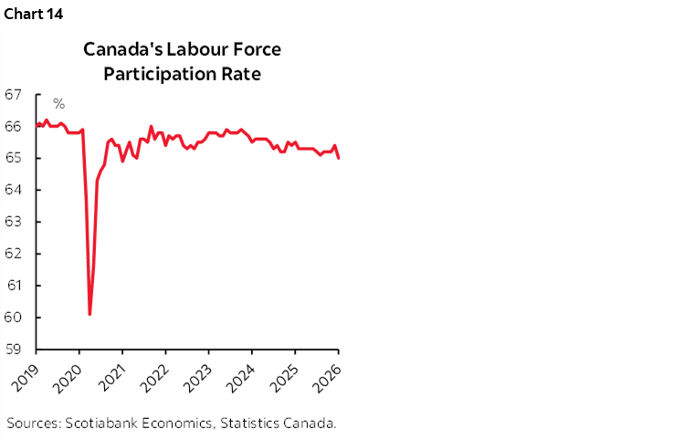 Chart 14 shows the slightly declining trend in the labour force participation rate. On the heels of Macklem’s supply-and-demand primer speech yesterday, it bears noting that if the demand for labour weakens, we need to consider the supply side along with it. Tighter immigration policy may be driving the monthly breakeven rate in Canadian jobs (that leaves the UR tight) closer to zero.