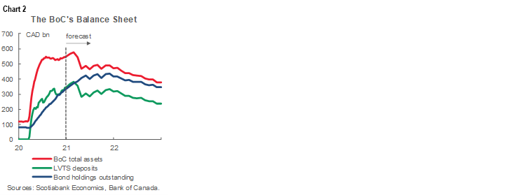 Following on these comments, chart 2 shows my updated forecast for the Bank of Canada’s balance sheet through to the end of 2022. We’ve been forecasting the balance sheet throughout the QE era at the BoC and present assumptions indicate that the balance sheet will begin to materially and sustainably contract throughout 2022 after netting out all of the drivers. The level of the balance sheet is projected to remain materially larger than before the pandemic and so would excess deposits held at the BoC. This is important to understand because the outcome doesn’t point to monetary policy stimulus being withdrawn outright and back to pre-pandemic levels. The balance sheet will be a slow boat to turn but steps have to begin well in advance.