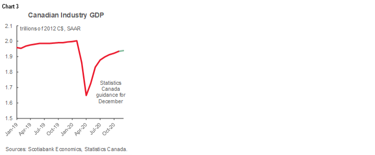 Furthermore, based upon the way Q4 ended, the first quarter of 2021 already has 1.7% annualized GDP growth baked in before we even get any Q1 data. Here too we’re tracking better than anticipated, but much more tentatively than the Q4 tracking. The BoC’s January MPR had forecast a 2.5% contraction in Q1 GDP and so the hand-off math is tracking more than four percentages stronger. January GDP will fix some of that I suspect on restrictions, school closings and nonessential business lockdowns, but if those restrictions get eased in February—which is plausible given falling case trends—then we could not only enter Q1 better than expected but also exit Q1 better than expected. Q1 GDP still faces high uncertainty, but the new information here is more positive.