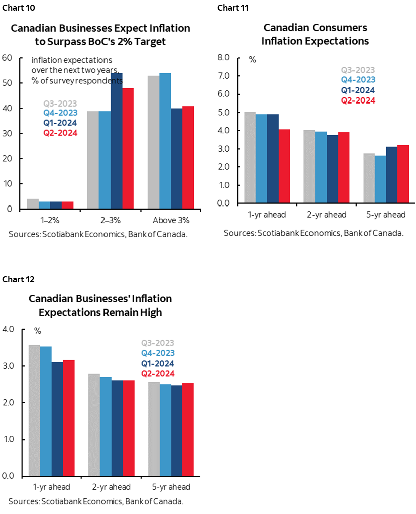 Furthermore, geopolitical tensions including effects on oil prices plus soaring global shipping costs add modestly to inflation risk with inflation expectations still up around the BoC’s upper bound of the 1–3% inflation target range (charts 10–12).