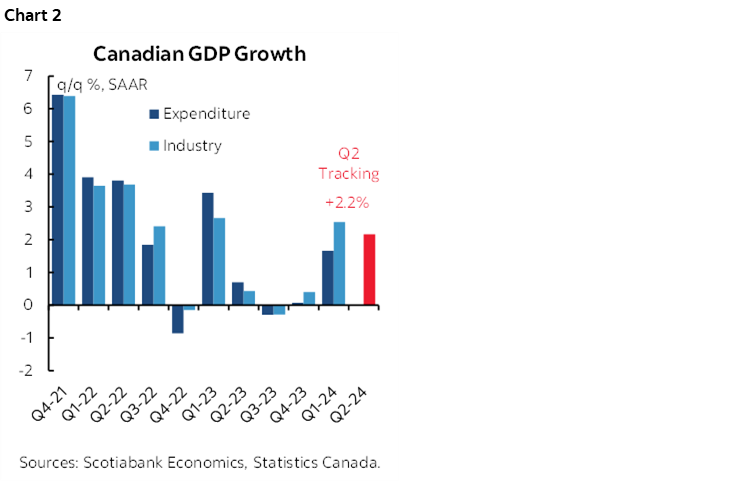 Start with GDP. The economy remains resilient (chart 1). GDP grew a smidge faster in May (0.16% m/m SA nonannualized) than Statcan had initially guided (0.1%). Further, whereas I had thought June might face downside risk based on limited readings such as hours worked, it instead grew by 0.1%. There were no material revisions to growth before May.