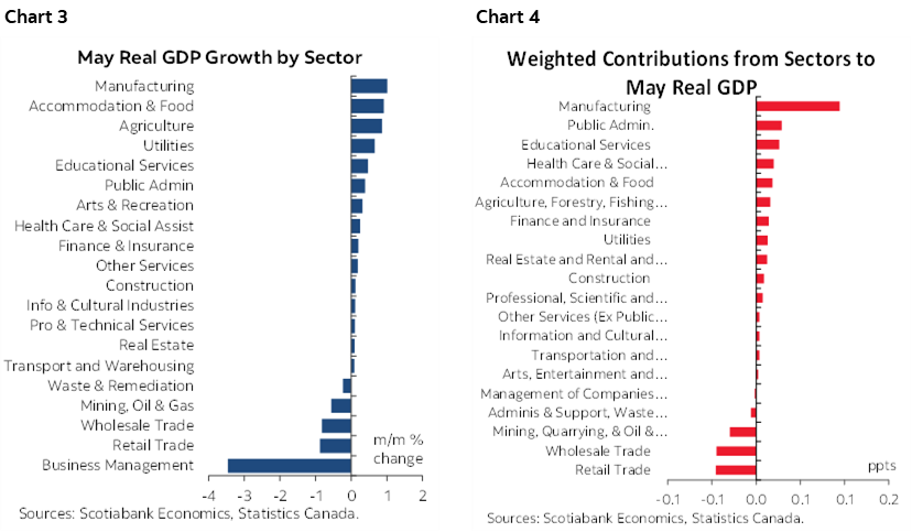Charts 3 and 4 break down monthly GDP for May in terms of unweighted changes by sector and weighted contributions to overall GDP growth.