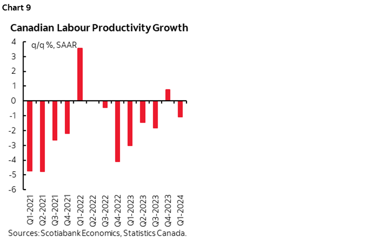 Productivity blows (chart 9). Accelerating wage gains while productivity sinks is an unwelcome combination of inflation risks. Maybe it will pick up in future as the BoC predicts, but they’ve made that prediction before and keep pushing it out. Besides, sustained productivity gains are needed, not just one-offs if population growth is cooled should the Feds and provinces tamp down non permanent immigration.