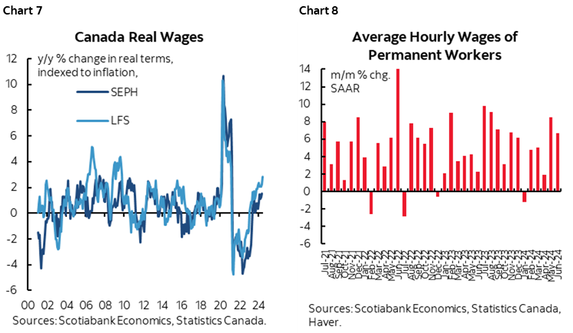 The same is true of core inflation. It was soft for transitory reasons over the first four months of the year and has since rebounded sharply to 4.1% m/m SAAR in May and 2.9% m/m SAAR in June (chart 5). Didn’t happen, didn’t see that, don’t want to see that, moving on, all seems to be the BoC’s bias despite the caution behind so many false starts on soft core inflation to date.