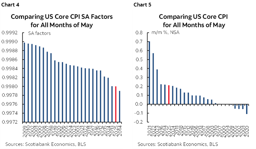 Now back to the reliability issue. The first reason why we should be careful is that seasonal adjustment factors drove the core CPI undershoot and I hadn’t expected that this time. The SA factors for May are normally more spread out than for some other months, but this time, the SA factors for 2025 and 2024 are among the lowest in history compared to like months of May (chart 4). This distorted the fact that in m/m NSA terms, the rise of core CPI really wasn’t at all out of the ordinary for a month of May (chart 5).