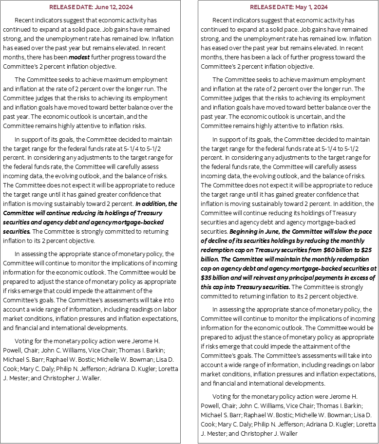 Please see the appendix for a statement comparison. Only one single word changed through the insertion of 'modest' further progress toward 2% inflation. Other than that, the only other change was just to put the QT changes in the present context after they announced them in the prior statement.