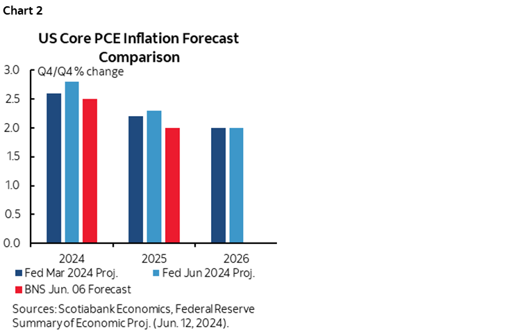 The Committee raised its projection for core PCE inflation by two-tenths to 2.8% this year, one-tenth to 2.3% in 2025, and left 2026 at 2%. That is higher than our forecast.