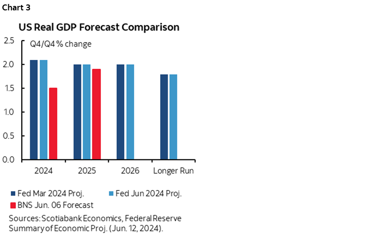 One reason for the Committee being higher than us on core PCE is that the Committee left GDP growth unchanged throughout the projection horizon. The median participant’s projection is for 2.1% Q4/Q4 GDP growth this year, 2% in each of the next two years, and the long-run potential growth estimate was left unchanged at 1.8%. This is above our forecast especially for this year (chart 3).