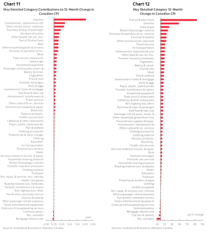 Chart 11 shows the weighted contributions to the year-over-year change in CPI and chart 12 breaks down the basket in raw, unweighted y/y terms. The top weighted contributor to year-over-year inflation is gasoline that accounts for 2.1 percentage points out of the 7.7% headline, but the other 5.6 percentage points is driven by a very broad array of price pressures.