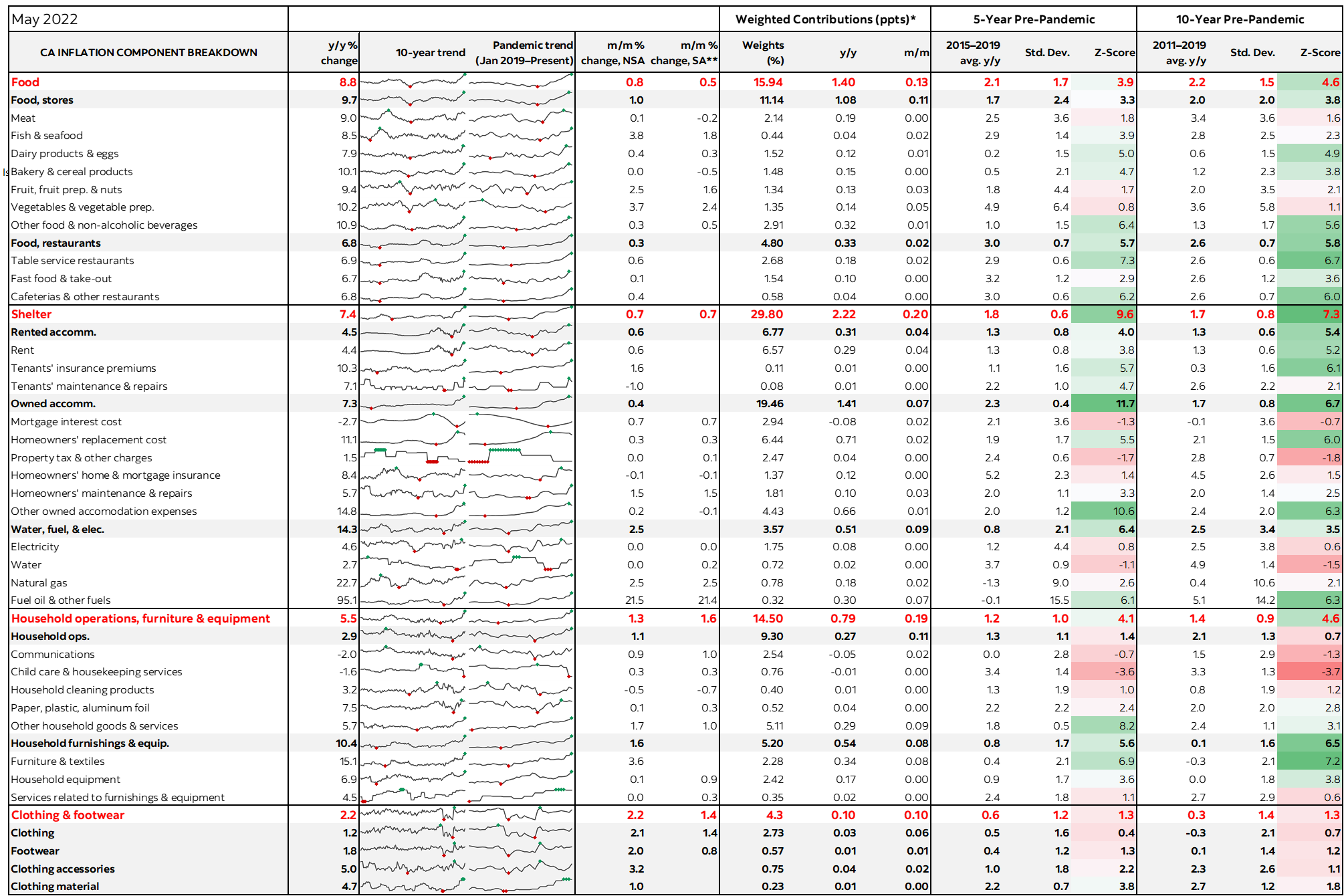 Prefer to take out energy and food inflation because, ya know, who pays that anyway?? Well ok, if you must, but CPI ex-food and energy was up 8% on the same m/m SAAR basis which matches the prior month’s reading after hitting 9% in March. CPI excluding the eight most volatile items that the BoC used to target back in the Mesozoic era was 7.7% m/m SAAR which is cooling from 12.4% in March and 9.5% in April.