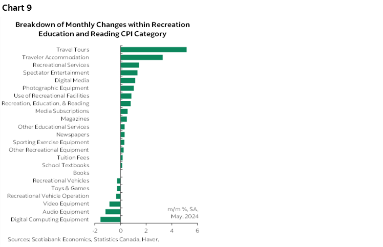 - Travel tours and accommodation prices spiked higher and were a leading cause of the large 0.6% m/m SA gain in the recreation, education and reading category (chart 9).