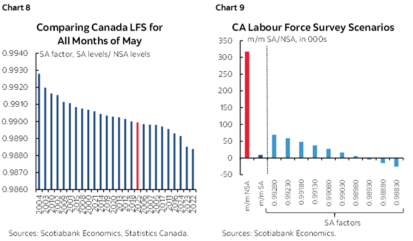 Unlike the distorted readings over January to April that were artificially depressed by cooked seasonal adjustment factors, that wasn’t the case this time. Chart 8 shows that the SA factor wasn’t a deep outlier this time, as May typically is not. Alternative scenarios for job growth at other SA factors would have still mostly generated decent job growth (chart 9).
