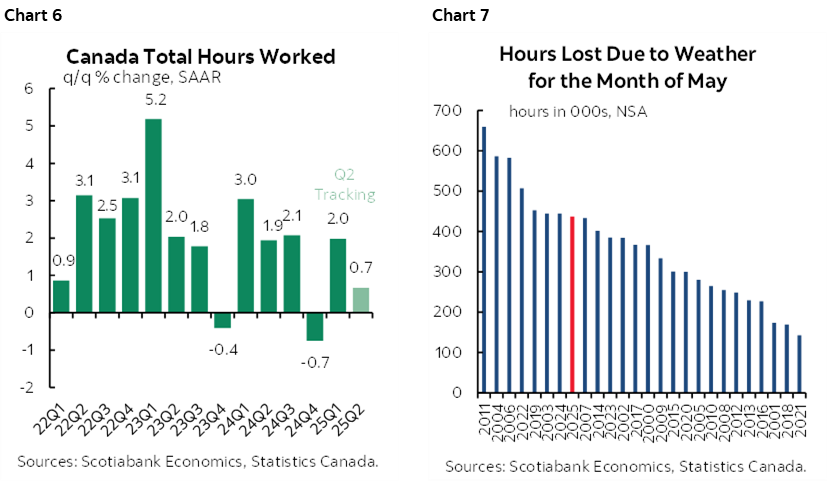 Despite the full-time job gain, hours worked were flat (-0.02% m/m SA). No change. And yet they are tracking a modest gain of 0.7% q/q SAAR in Q2 which is mildly supportive of GDP growth defined as hours worked times labour productivity (chart 6). Weather didn’t help (chart 7).