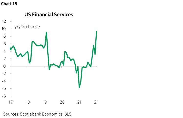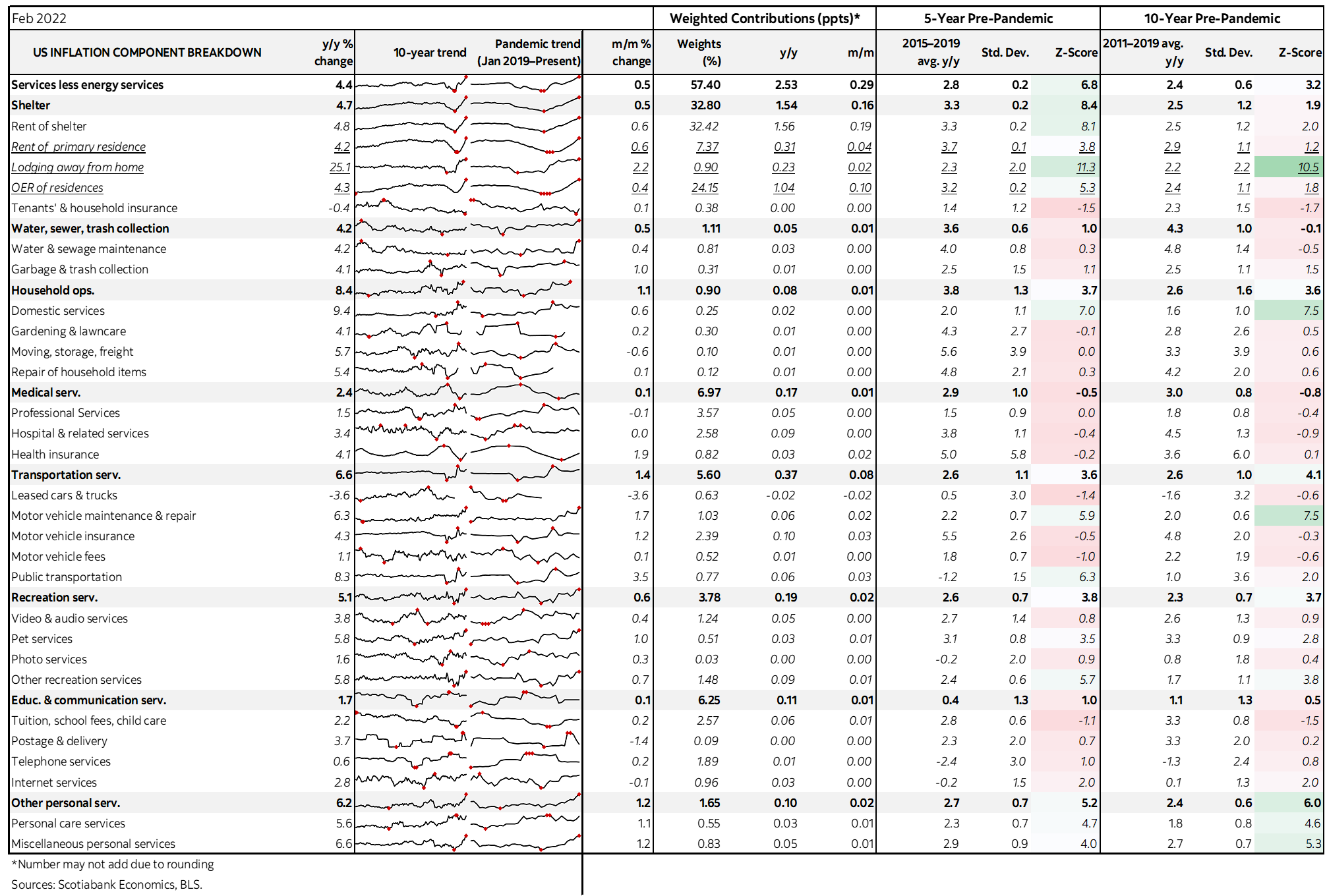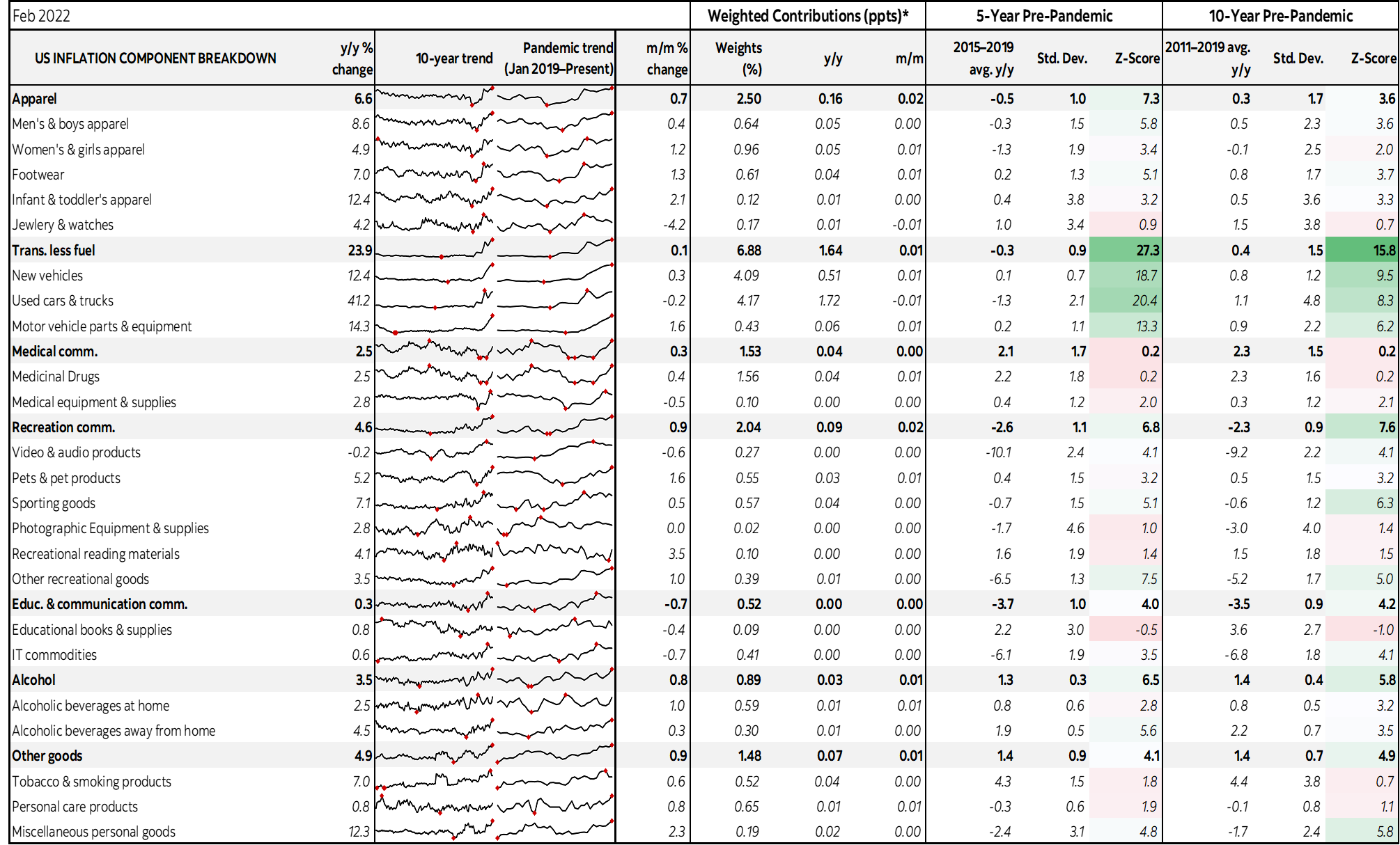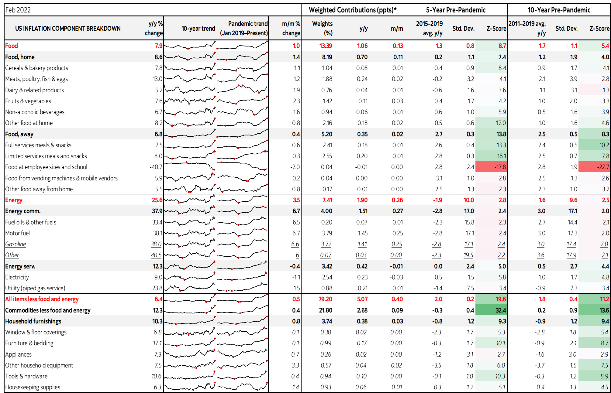 Charts 8–16 break out some of the key components in year-over-year terms. The accompanying table at the back provides much richer information on the drivers of inflation and uses z-scores to indicate how far out of the norm have been recent price changes compared to years past.