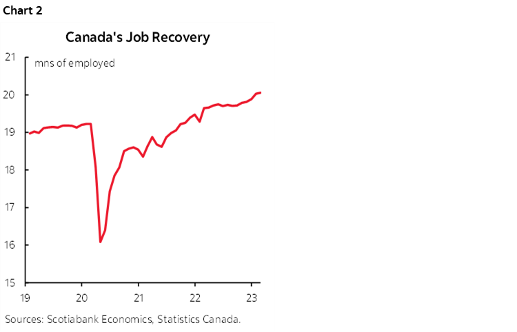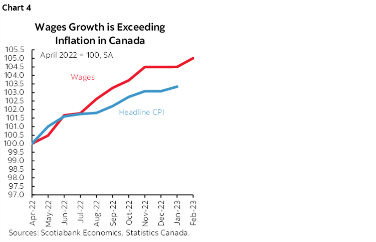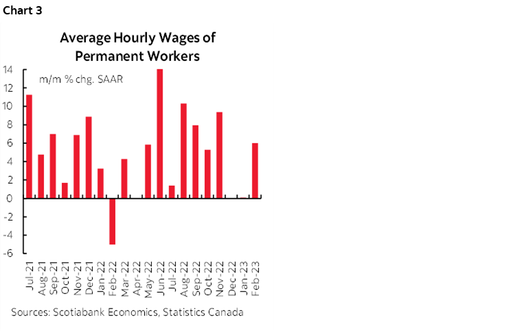 Wage growth took off again. Average hourly wages of permanent employees were up by 6% m/m at a seasonally adjusted and annualized pace in February. Canada had gone through a soft patch for wage growth in December and January and February’s gain takes that back up to the powerful gains that were being recorded from about last May through to November (chart 3). More data is required to avoid over-reacting to either the soft patch or the resumption of strong gains. Still, the BoC likes to quote year-over-year wage growth for whatever reason and it picked up to 5.4% from 4.5% the prior month.
