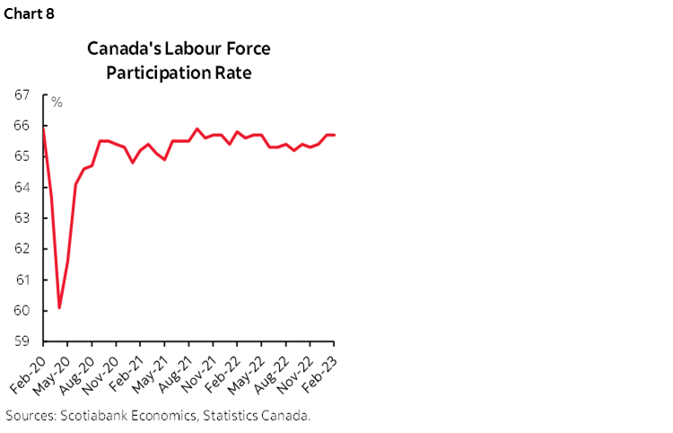 The unemployment rate held steady at 5%. That was because the employment gain of 22k was outpaced by a 42k rise in the size of the labour force but that wasn’t a big enough different to impact the UR. The labour force participation rate was unchanged at 65.7% (chart 8).