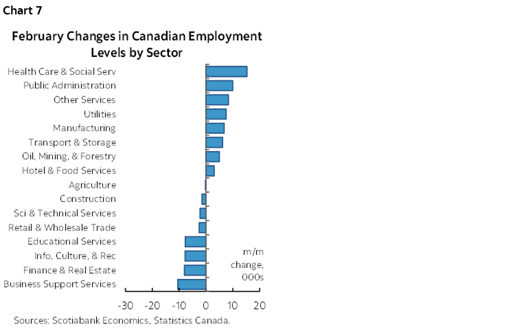 By sector, it was goods-producing industries that led the way for a change (chart 7). Manufacturing added 7k with utilities up 8k and resources added 5k. Service sectors added only 4k with the main addition coming through health care and social assistance (+15k) as well as transportation and warehousing (+6k).