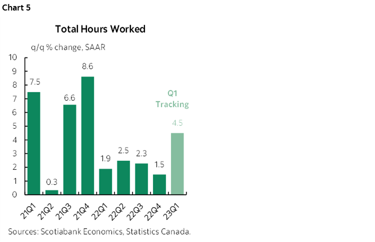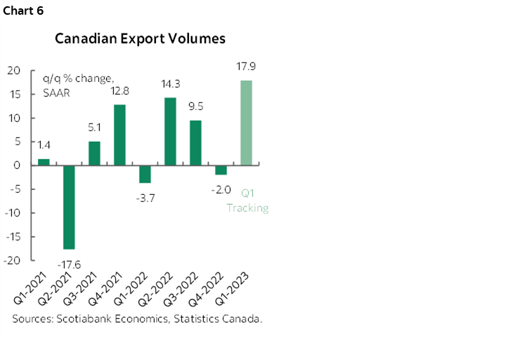 Since GDP is hours worked times labour productivity, the strong gain in hours is a positive indicator for GDP. When added to the strong gain in exports that is being tracked so far for Q1 (chart 6) the overall effect suggests that Q1 GDP growth will be strong.