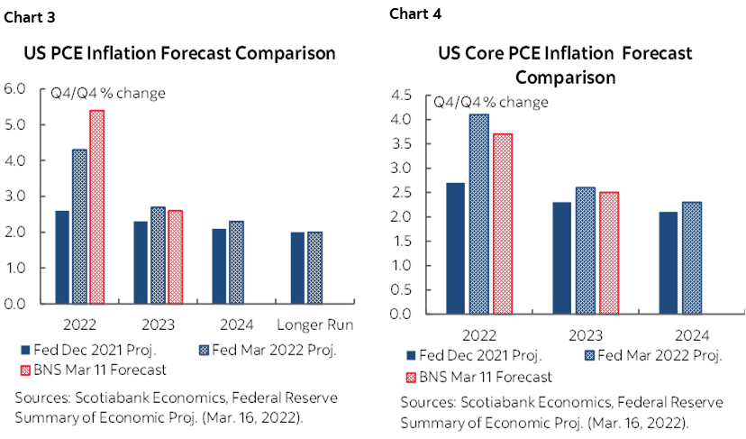 The FOMC is indicating it expects a persistent overshoot of its 2% inflation target. The FOMC raised projected inflation in each of 2022, 2023 and 2024 on both a PCE and core PCE basis (charts 3, 4). It now anticipates headline inflation of 4.3% in 2022 (2.6% prior), 2.7% in 2023 (2.3% prior), 2.3% in 2024 (2.1% prior) and the longer run goal is unchanged at 2%. Core PCE is projected to rise by 4.1% this year from 2.7% in December, 2.6% next year from 2.3% previously, and 2.3% in 2024 from 2.1 previously.