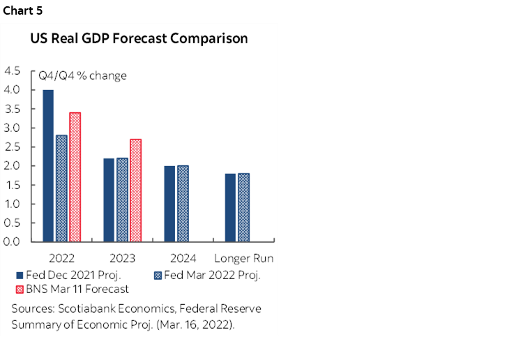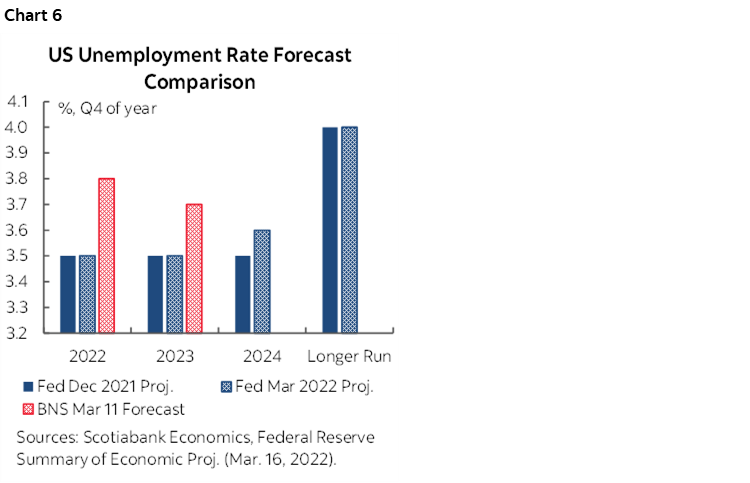The 2022 projection is well below our forecast at 3.9%. When Powell was asked about the downgrade in his presser he said “It's an early assessment of the effects of the spillover from the war. Higher oil and other commodity prices will weigh on GDP to some extent. Monetary policy works with a lag so some tightening will be behind that. Still, 2.8% is still very strong growth that is well above potential GDP growth.”