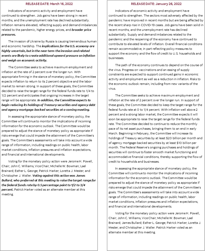The statement referenced how holdings of Treasuries and MBS will likely begin to decline “at a coming meeting.” That’s a bit softer language compared to when the Fed uses “soon” to imply a move at the next meeting, but Powell’s press conference kept the door open for an announcement as soon as the May meeting. It sounds like there will be little if any gap between an announcement and implementation given the statement reference to “begin reducing,”