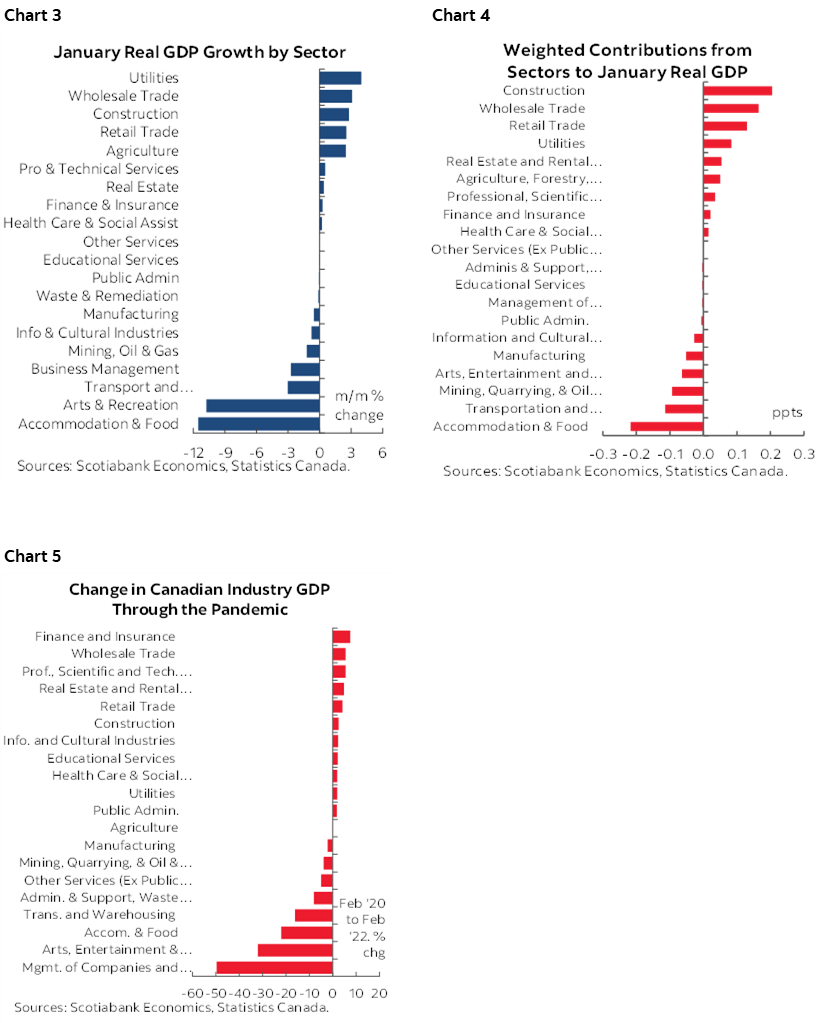 A big caveat is that the BoC forecasts expenditure-based GDP whereas the monthly figures are based upon production/income side GDP accounts. The latter doesn’t generally consider factors like inventory swings and changes in import leakage effects. We think those effects will probably drive GDP growth in Q1 toward the ~5% annualized range.