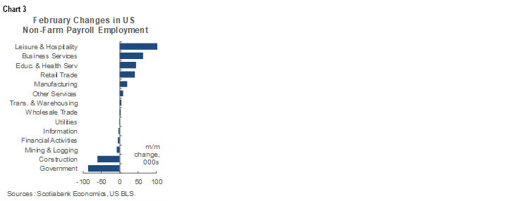 Second, the hiring gain was fully driven by the service sector (+513k). The sector breakdown is shown in chart 3. Goods sectors shed 48k jobs. Within goods, the construction sector was down 61k but the Bureau of Labour Statistics blamed that on weather disruptions to construction projects and so one should expect that component to bounce back. So I guess we could take out the construction decline as transitory which helps the headline job gain.