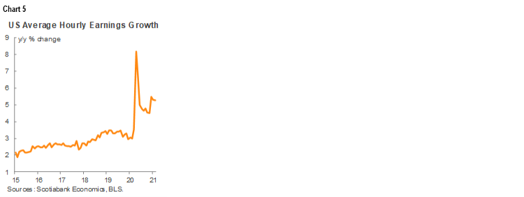Wage growth was unchanged at 5.3% y/y but the prior month was revised down a tick from 5.4% (chart 5). The fact that the rise in jobs was concentrated in the lowest paying areas acted as a constraint against the change in overall wage growth. Average wage growth remains misleading because of all the lower paid pandemic-hit jobs that fell out of the calculations.