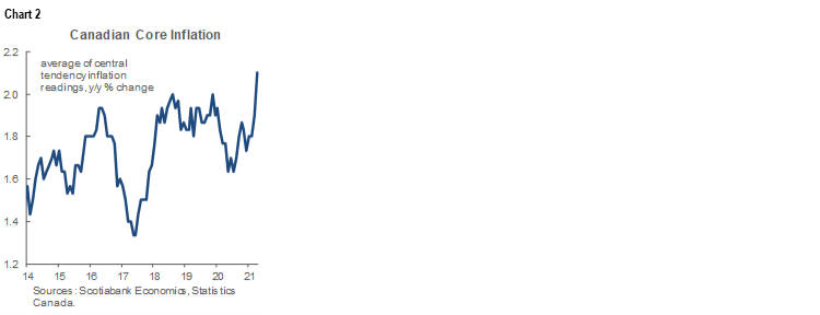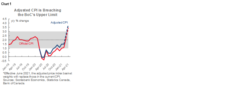 Before delving into the details, recall that one should be taking the official year-over-year rate and adding about 0.4% to it to get the measure that will become official with June CPI released in July. At that point, StatsCan will revise basket weights in CPI to reflect how people are spending during the pandemic. In other words, ‘true’ headline inflation is running at about 3.8% y/y which is blowing the BoC’s bands (chart 1). We haven’t seen a higher number than 3.4% y/y inflation since May 2011 and we haven’t seen a higher number than 3.8% y/y since March 2003. Revised weights that reflect pandemic realities may also bump the core inflation measures higher when Statistics Canada shifts weights in July, but there has been no guidance to date on how unofficial core inflation may be tracking and no detailed breakdown of the pandemic-era weights to enable calculation of pandemic-era core measures.