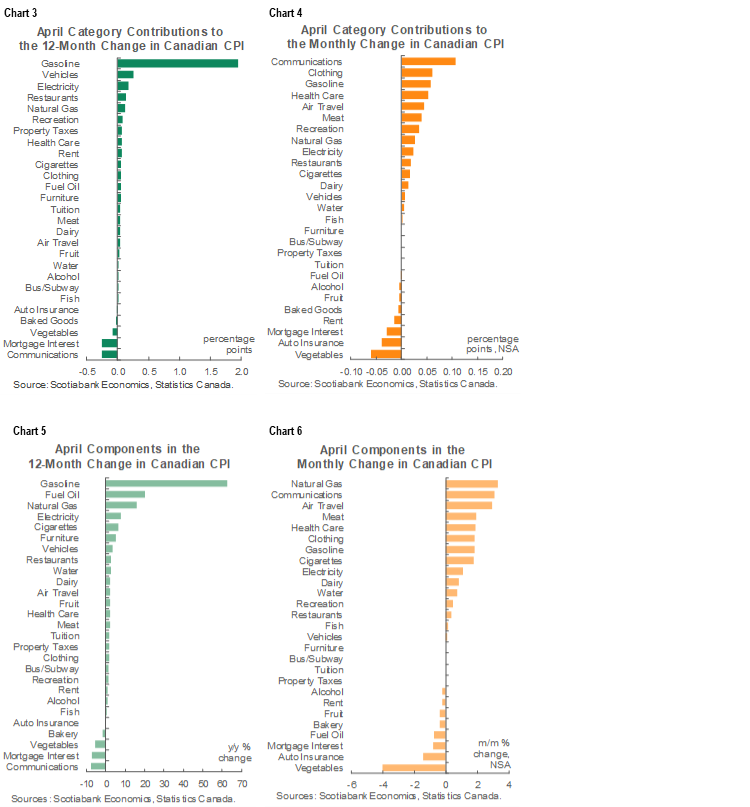 Further, all seasonally adjusted categories were strong. Recreation/reading/education was up 1.4% m/m SA and carries a 10.2% weight in CPI. Health and personal care prices were up 1.3% m/m SA (4.8% weight). Household ops/furnishings/equipment prices were up 0.8% m/m SA (12.8% weight). Shelter was up 0.5% m/m SA (27.4% weight). Food prices climbed by 0.3% m/m SA with a 16.5% weight. Transportation and clothing/footwear were both up 0.5% m/m SA and carry weights of 20% and 5.2% respectively.