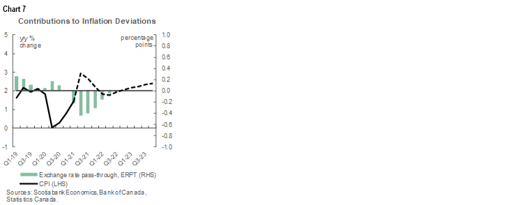 Also recall that by the BoC’s estimates in the April MPR, the currency is already supposed to be tamping down inflationary pressures on a transitory basis particularly as it climbs higher since the MPR (chart 7). A permanent appreciation in the currency is a sustained impact upon the level of CPI but not on the inflation rate itself. Therefore, unless we’re on a march to parity here, then as the currency’s repricing of the outlook begins to stabilize then the disinflationary effects of its rise should also begin to drop out. In other words, absent this headwind, inflation could be stronger.